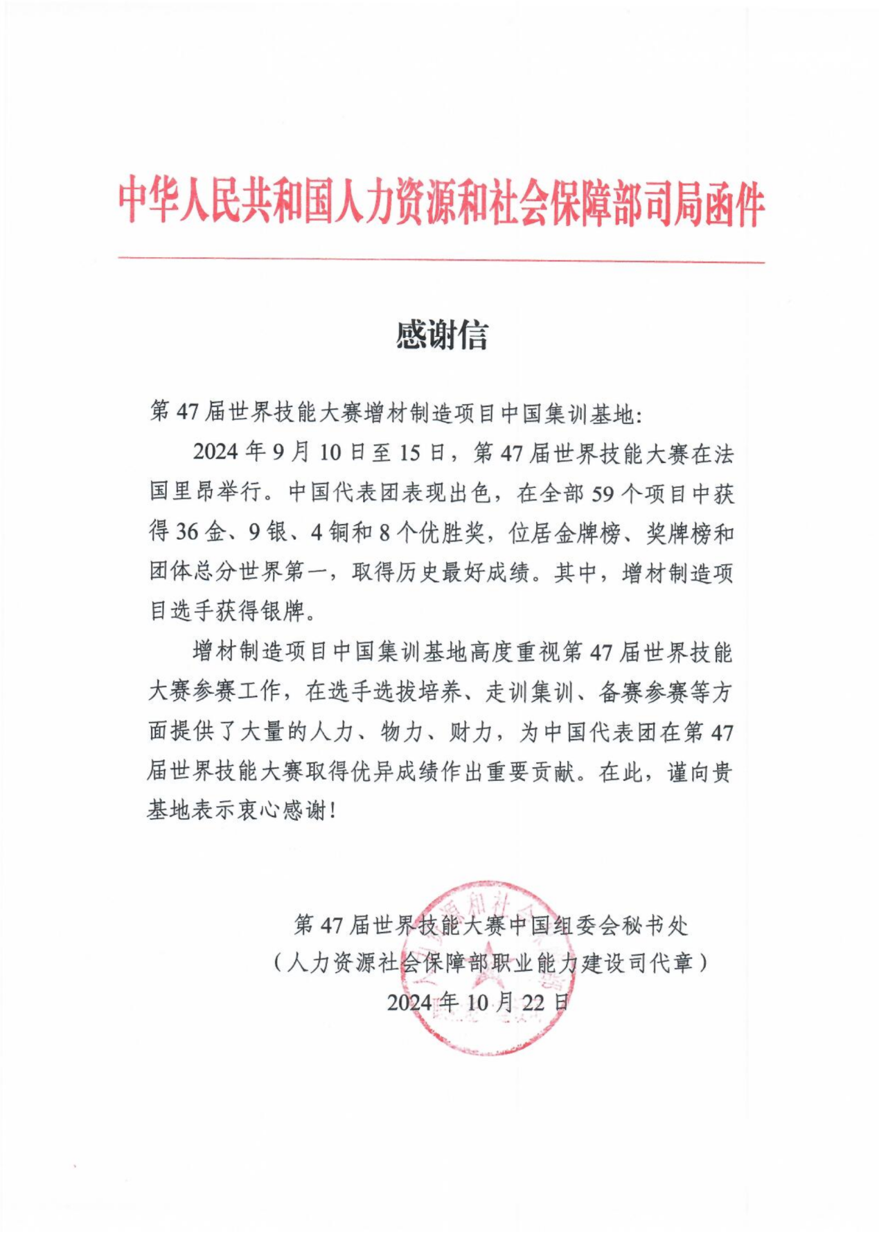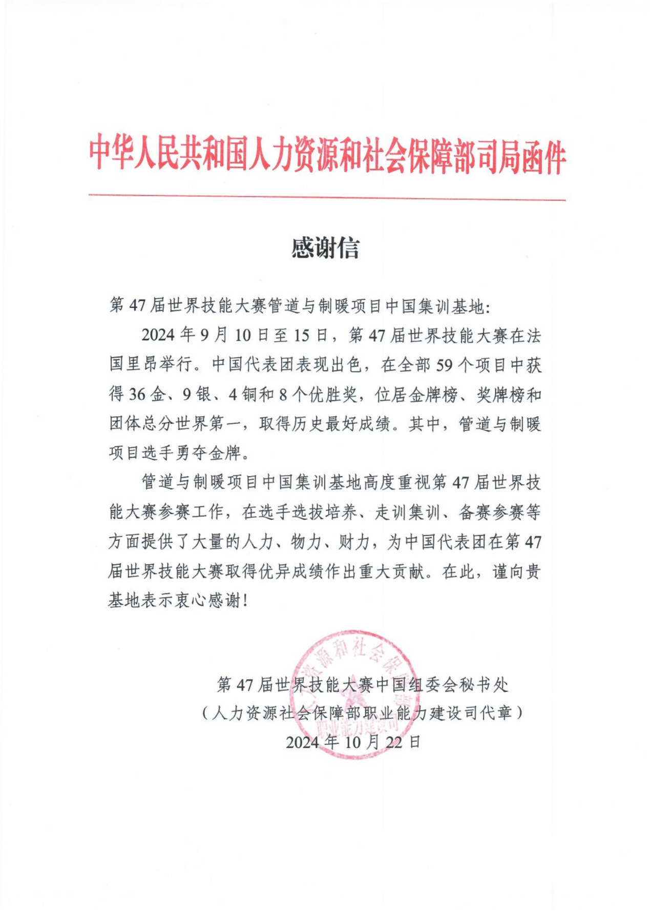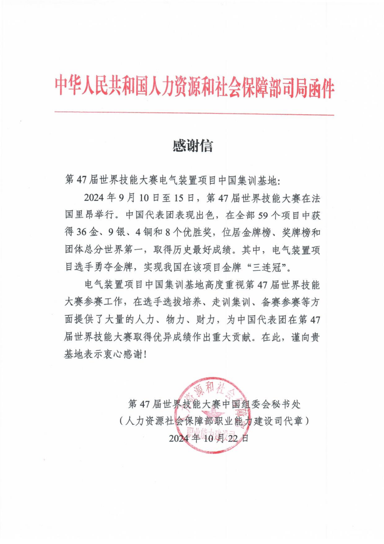 10月22日,國(guó)家人力資源社會(huì)保障部職業(yè)能力建設(shè)司第47屆世界技能大賽中國(guó)組委會(huì)秘書(shū)處,分別向榮獲第47屆世界技能大賽榮獲金牌的電氣裝置、管道與制暖項(xiàng)目,榮獲銀牌的增材制造項(xiàng)目等3個(gè)中國(guó)選手集訓(xùn)基地發(fā)來(lái)感謝信,感謝3個(gè)集訓(xùn)基地在選手選拔培養(yǎng)、走訓(xùn)集訓(xùn)、備賽參賽方面提供的支持,以及為中國(guó)代表團(tuán)取得優(yōu)異成績(jī)作出的重大貢獻(xiàn)。