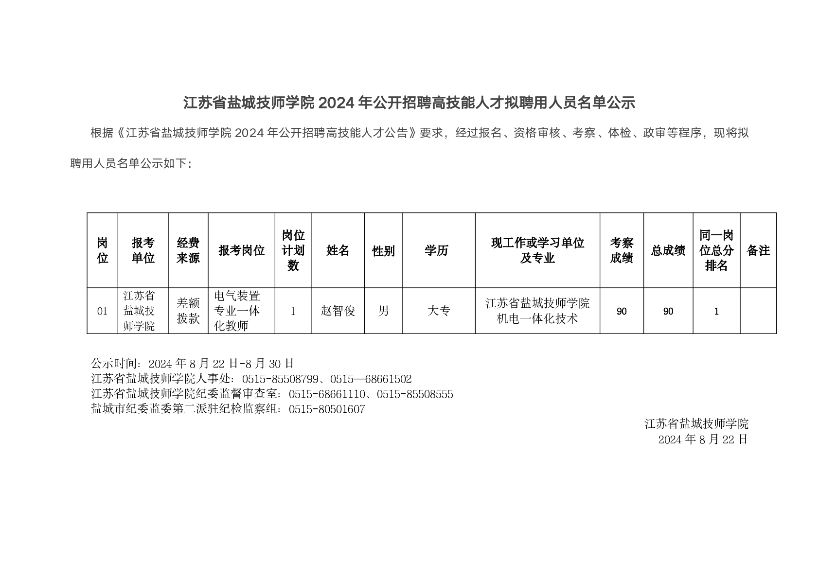 江蘇省鹽城技師學(xué)院2024年公開招聘高技能人才擬聘用人員名單公示