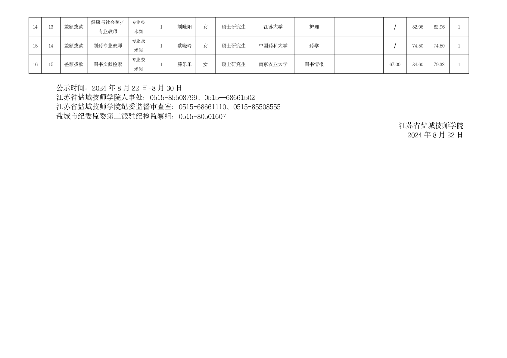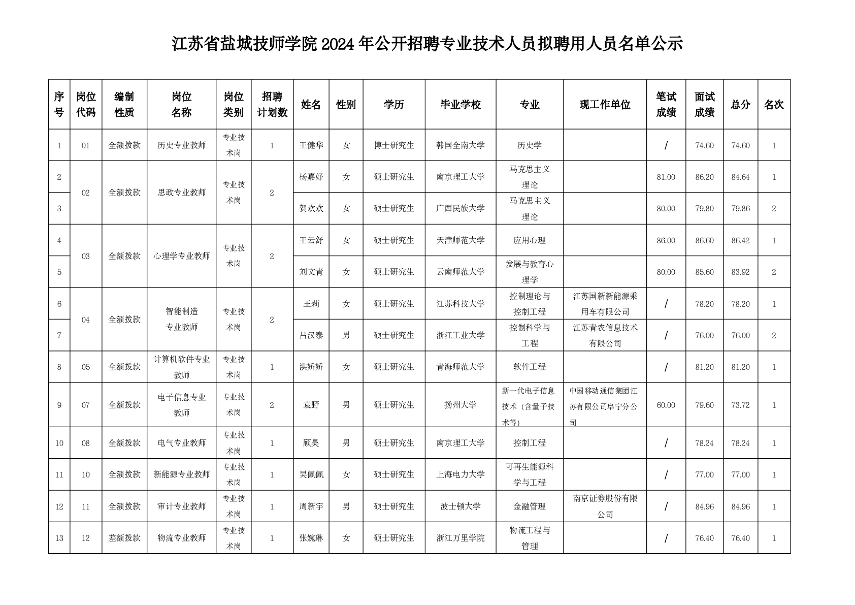 江蘇省鹽城技師學(xué)院2024年公開招聘專業(yè)技術(shù)人員擬聘用人員名單公示