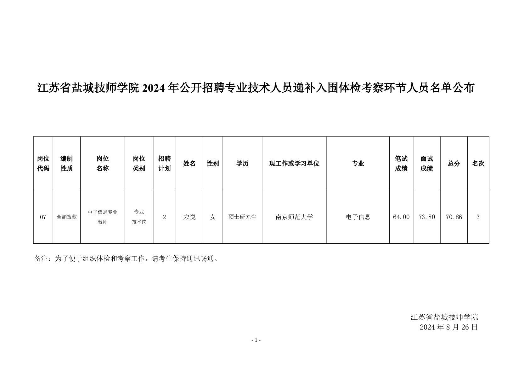 江蘇省鹽城技師學(xué)院2024年公開(kāi)招聘專(zhuān)業(yè)技術(shù)人員遞補(bǔ)入圍體檢考察環(huán)節(jié)人員名單公布