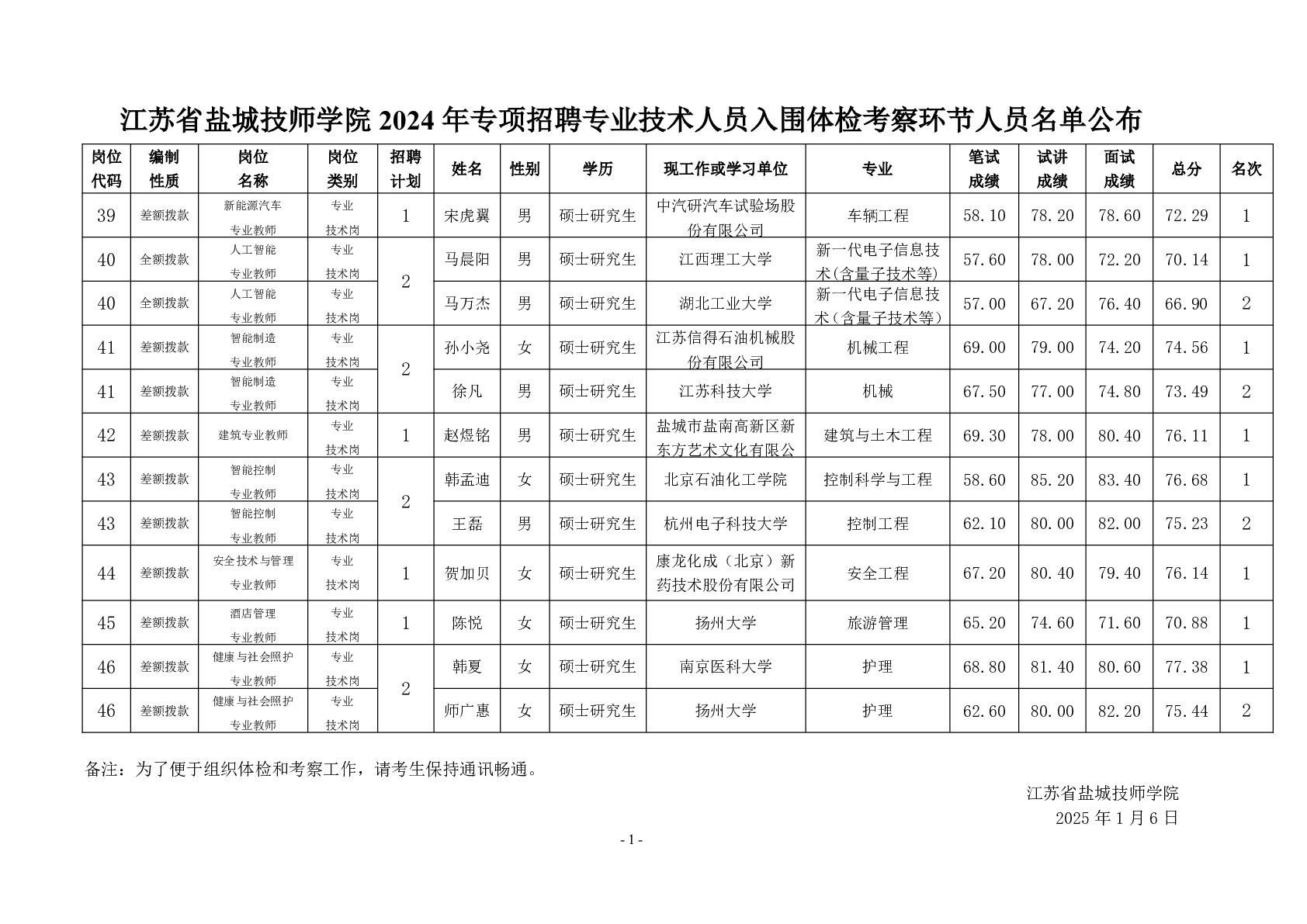 江蘇省鹽城技師學(xué)院2024年專項招聘專業(yè)技術(shù)人員入圍體檢考察環(huán)節(jié)人員名單公布