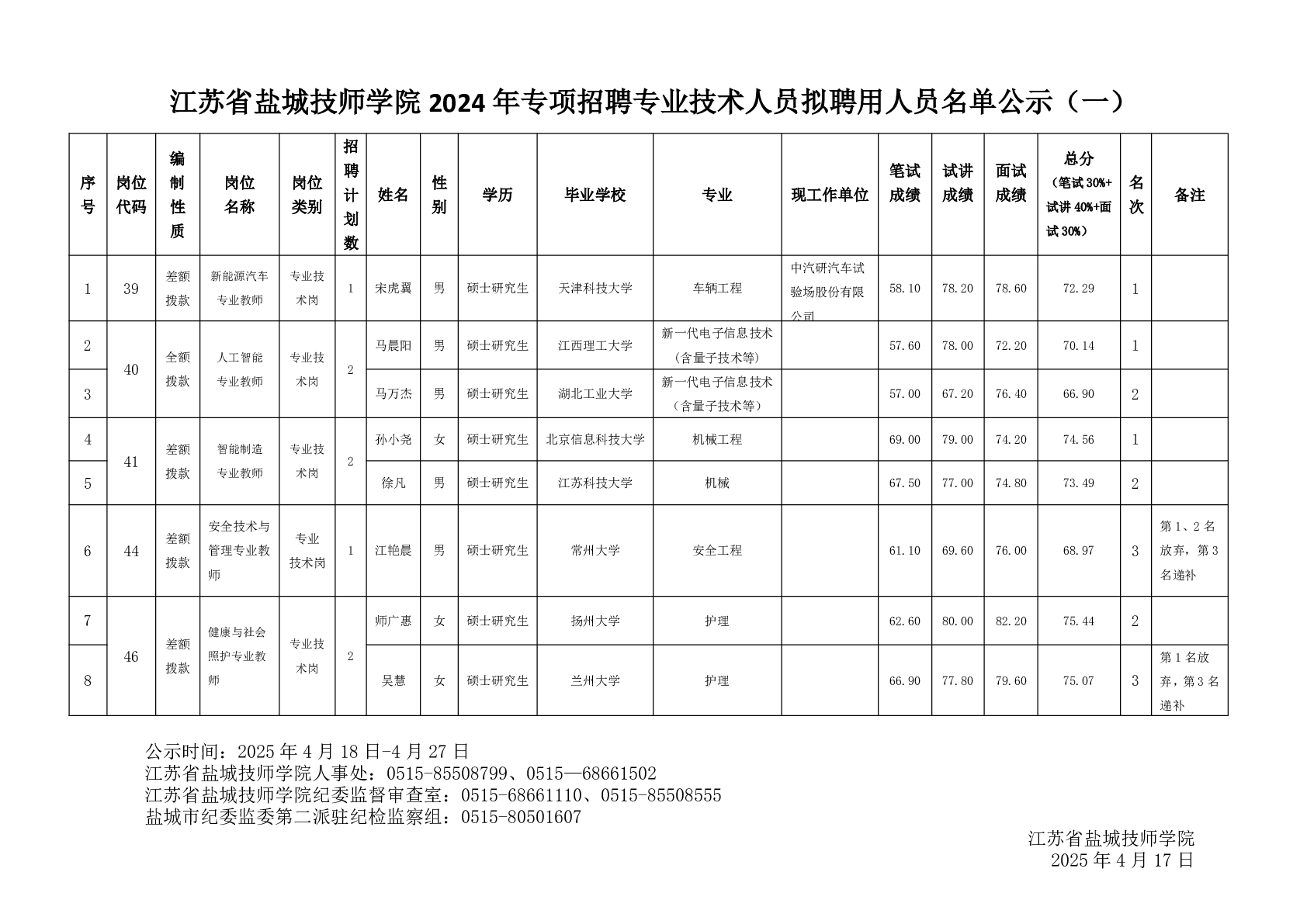 江蘇省鹽城技師學(xué)院2024年專(zhuān)項(xiàng)招聘專(zhuān)業(yè)技術(shù)人員擬聘用人員名單公示 (一)